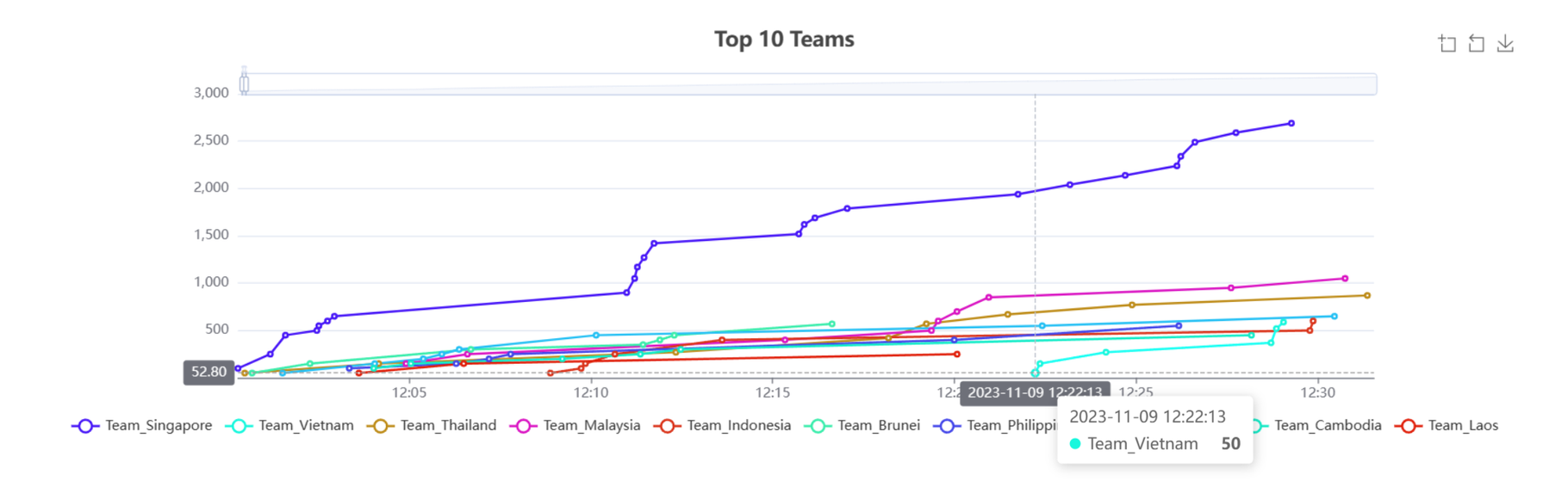 Breakthrough 1: About 30 minutes after solving the first challenge, the team surged from the bottom of the leaderboard to 6th place, trailing behind Singapore, Malaysia, Thailand, Brunei, and Myanmar.