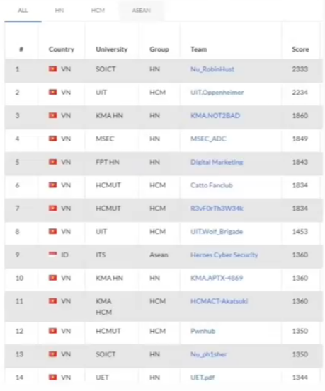 The RobinHust team from Hanoi University of Science and Technology was deeply honored to lead Phase 1 of the ASEAN Student Cybersecurity Contest 2023. Thanks to this achievement, the team was selected to represent Vietnam at the Cyber SEA Game 2023 in Bangkok, Thailand.