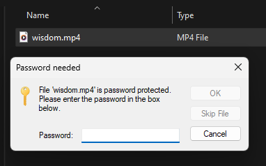 And this zip file requires us to enter a password... to extract a file named wisdom.mp4.