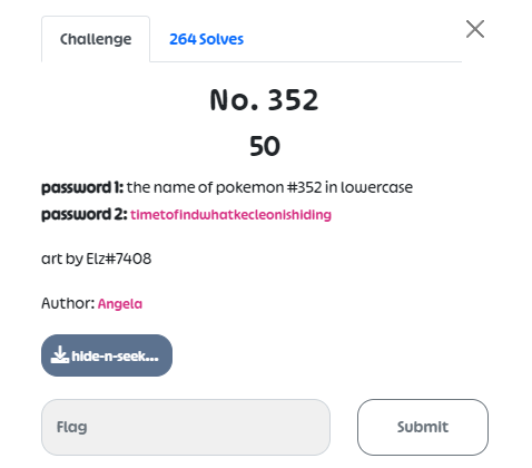 Here, there is a mention of password 1 and password 2, which made me think of the steghide tool (pay attention to password 1, which is the name of Pokemon number 352 - written in lowercase).