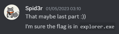 Here comes the one wrong step, one mile astray moment. From those code snippets and the mentioned command, I only interpreted the PowerShell command executing explore.exe in connection with the challenge name Malware Chall Disclaimer. As a result, I misunderstood that I had to dive into researching that malware to trace it down :)), wasting two hours trying to trace and reverse-engineer that explore.exe while also attempting to decipher it before reaching the solution.